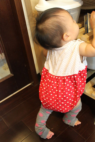3.會攀著東西立著跪站起來,除了站在嬰兒床邊,會攀上任何有高度的東西看看看,例如櫃子、桌子,還開始沿著沙發慢慢走來走去,媽媽會在莎莎背後墊上costco的長抱枕,這樣莎莎跌坐下來也不會哭哭。