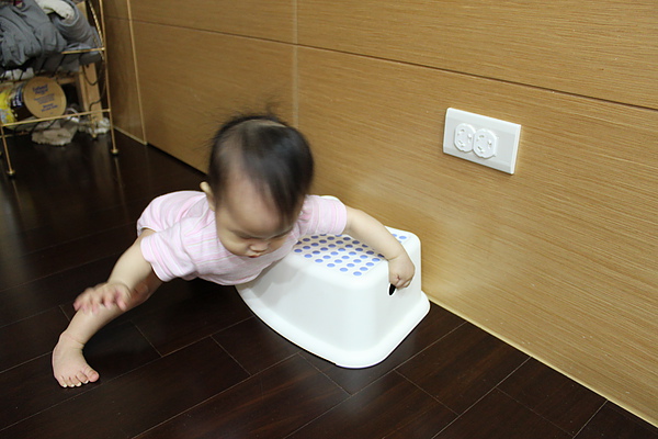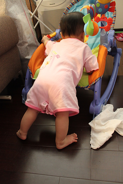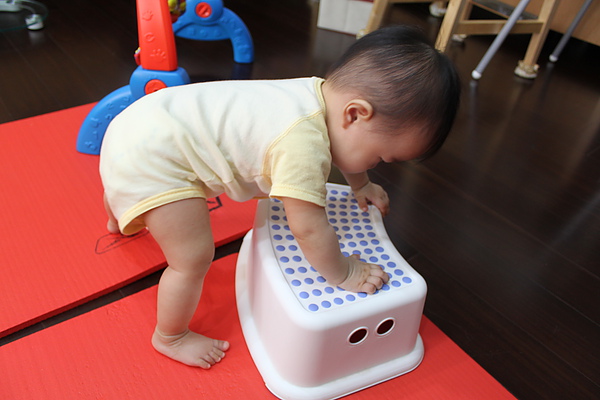 4.現在站的很穩,一開始會有腳背施力的動作,現在完全不會喔,腳掌很穩扶著東西站著好好的,也會從一手扶住沙發另一手揮舞著慢慢找到施力點,緩緩的坐下;有一次從攀著高腳椅跌了狗吃屎,鼻子受傷,後來慢慢的在高腳椅下也會變換方向坐下。