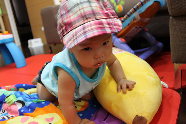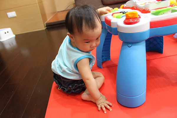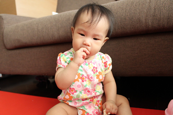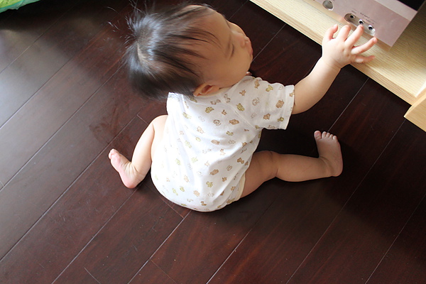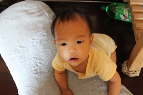 2.已經可以扶著沙發跟媽媽移動幾步了,也會輕輕的坐下再爬爬移動,有時候會放單手站站。莎莎躺在抱枕上可以挺腰讓自己坐起來了,不需要翻翻喔,坐的很穩了~~爬爬爬的時候,也可以順利回到坐姿。