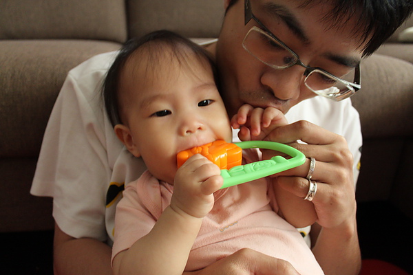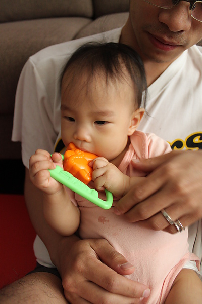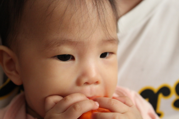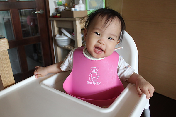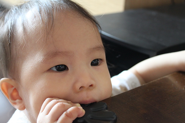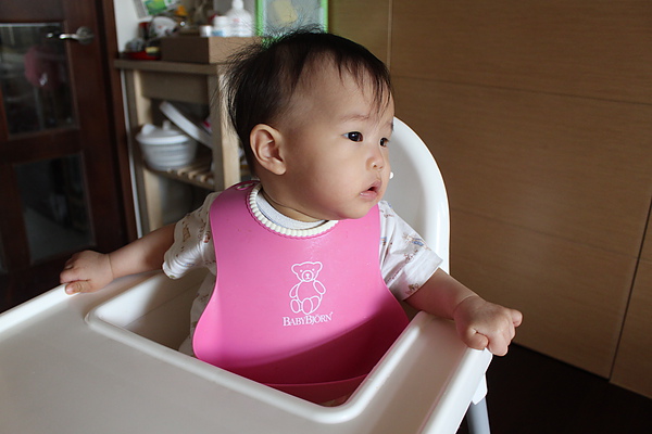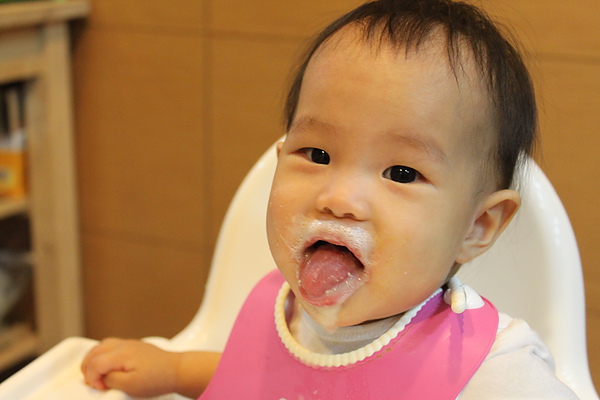 10.餵副食品的時候,有時候會出現生氣大力咬東西的動作。本來想幫莎莎副食品分類,但是莎莎要吃蠻久的會累,所以還是吃食物泥。