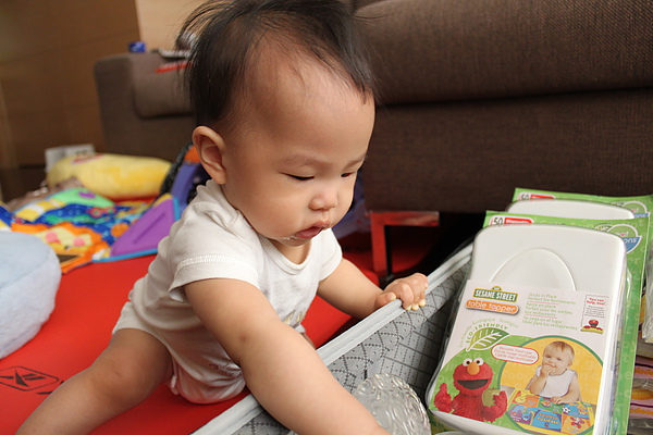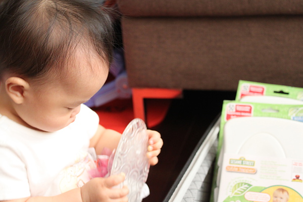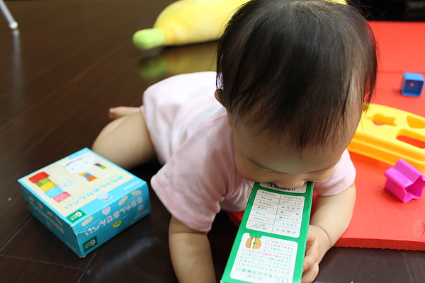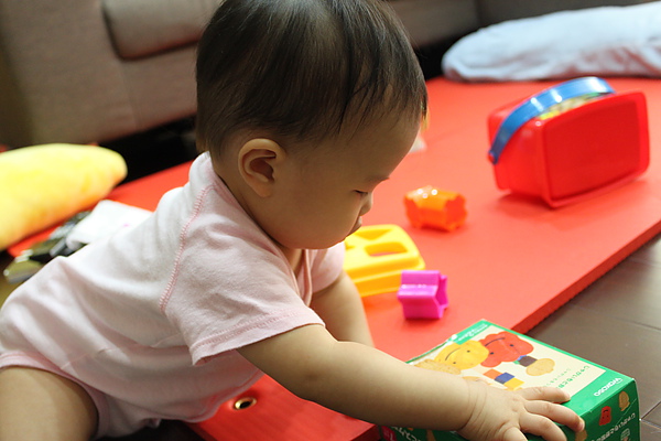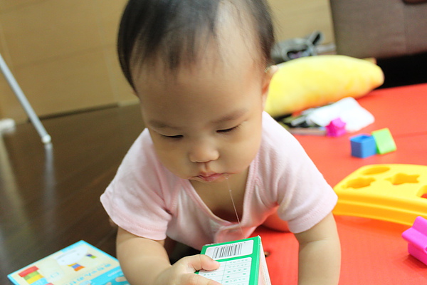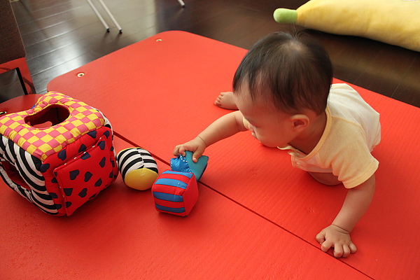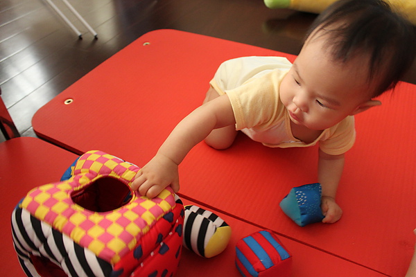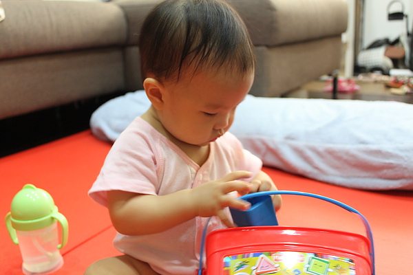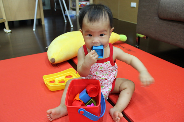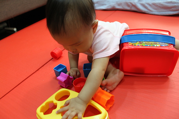 現在還不會把積木依圖形丟進去,只會敲敲敲~