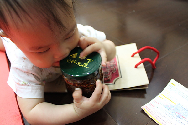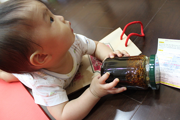 去南庄買的伴手,屋簷下桂花釀,但是因為有蜂蜜,所以莎莎不能吃,只好啃瓶子過乾癮~~