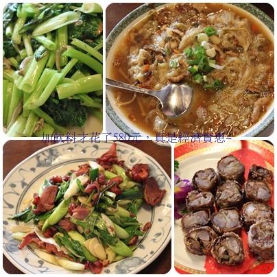 小魚乾炒空心菜、西滷肉、蒜苗臘肉及芋頭肉捲,吃的三個人不亦樂乎,真是便宜又大碗,