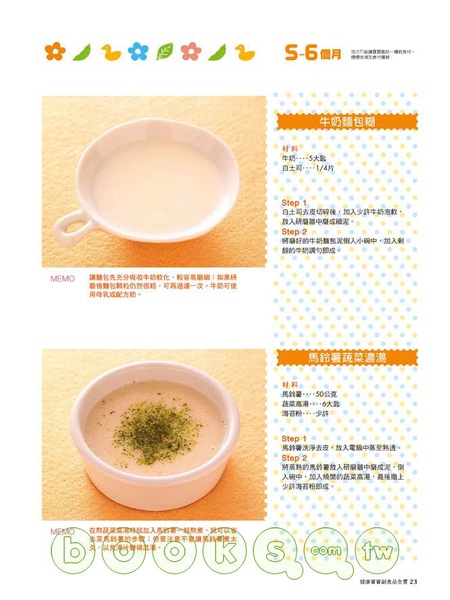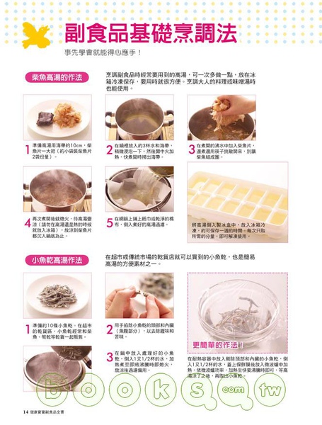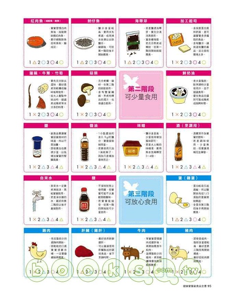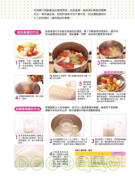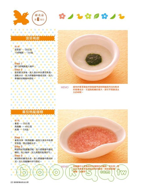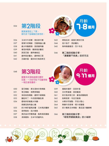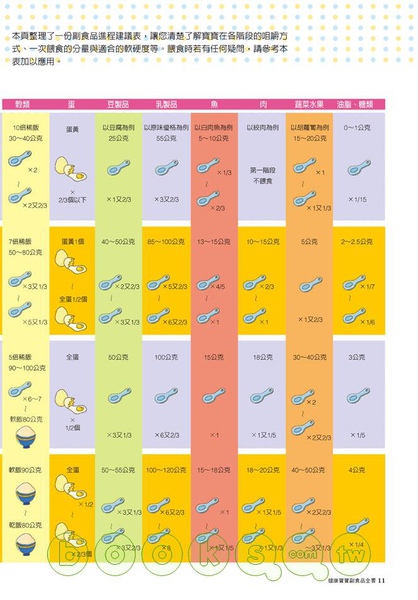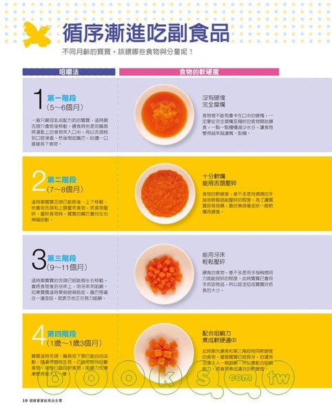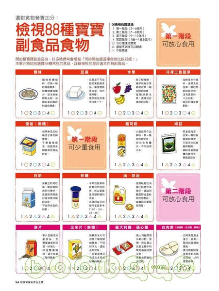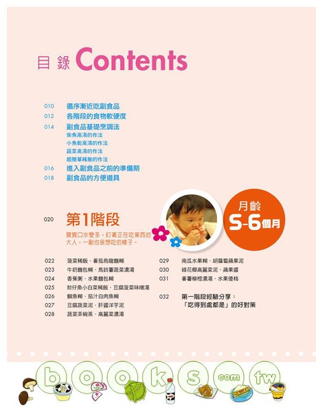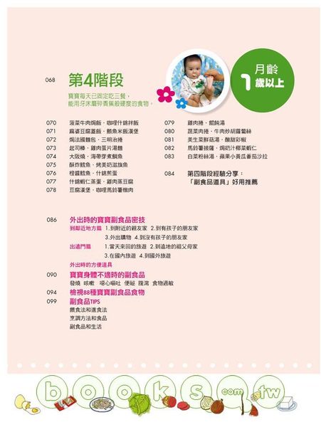 精彩內容包括:四階段副食品進程,副食品基礎烹調法,檢視88種常見副食品食材,副食品的方便道具,配合時間、地點和場合的副食品,寶寶身體不適時的副食品,以及副食品POINT等等;寶寶副食品食譜則分為四個階段,每一階段均有20 ? 30道最實用的副食品食譜,並且清楚講解餵食重點,以及可能遇到的各種問題。只要一書在手,就能搞定所有關於寶寶副食品的大小事,是新手爸媽們最實用的育兒飲食寶典。