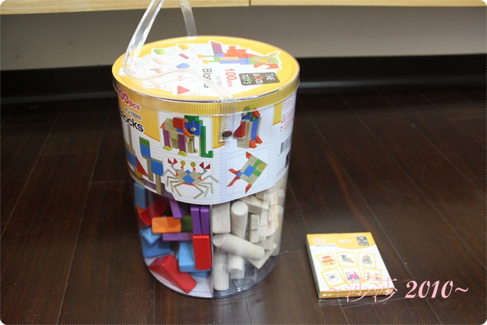 一桶積木及圖卡,積木可以照圖卡上的導引玩。