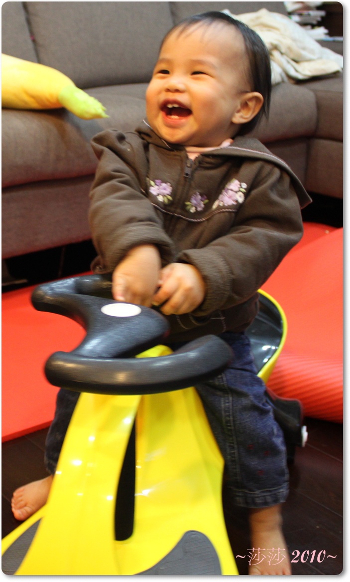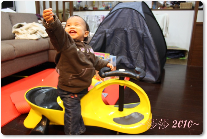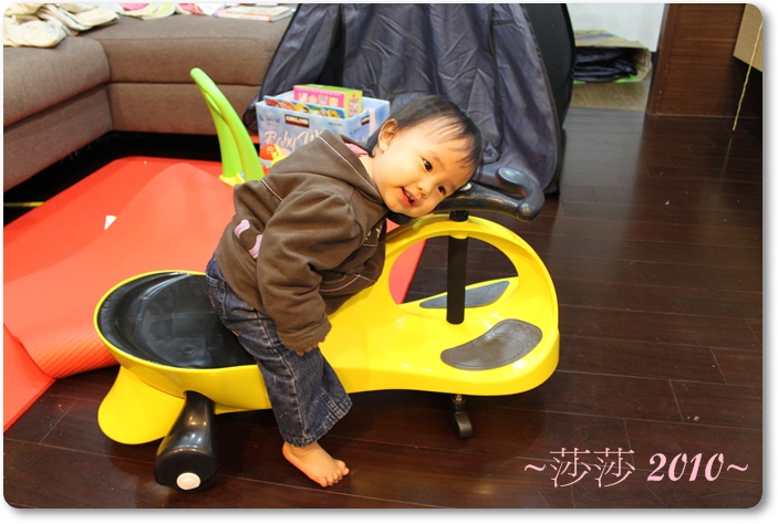 莎莎生日當天還是先拆了他的禮物,扭扭車。