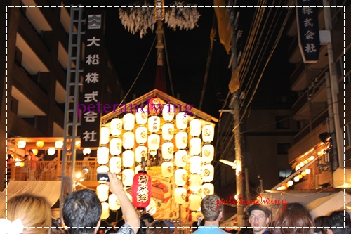 一路從四條大宮開始走往河原町,路上穿浴衣的人愈來愈多,愈來愈有節慶氣氛,再來就是各式各樣的山鉾,晚上點燈很炫爛美麗,還有人一邊演奏樂器,及好多夜市攤子,整個四條熱鬧非凡,真的是很有趣。