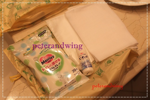 寶貝的備品,濕紙巾,沐浴乳,沙布巾。