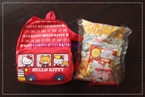 在AEON幫莎莎買了可愛kitty後背包,裡面還送了爆米花及餅乾等零食。