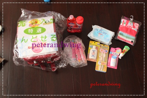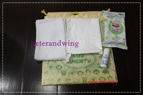La suite kobe的嬰兒備品,有小袋子、沐浴乳、濕紙巾及紗布巾。