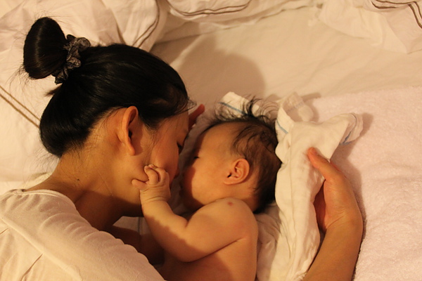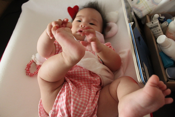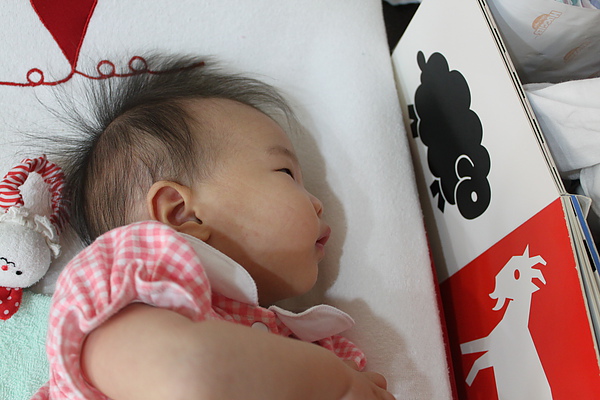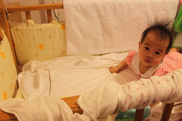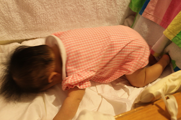 2.這個月進步了,在家裡沒哄睡過,總是把自己的床玩的亂七八糟的睡著,四肢撐起搖床,一直蠕動到嬰兒床的最前端;不過出去就沒辦法睡著了,一定要媽咪抱或拔拔背帶背。