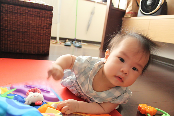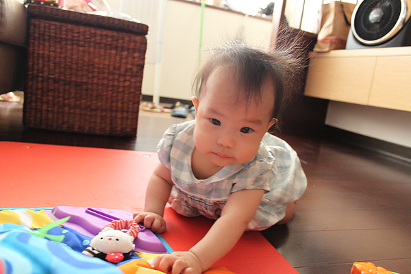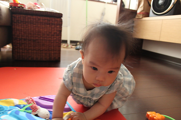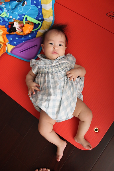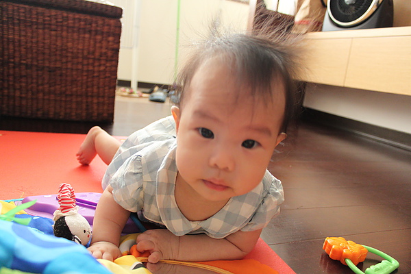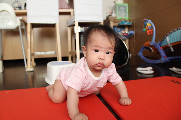 3.四肢離地後,會輕輕把身體放下,手向前伸,再挺起來,可以橫越瑜珈墊了,接著在家裡不斷的爬爬爬,也可以爬回來找媽咪了~